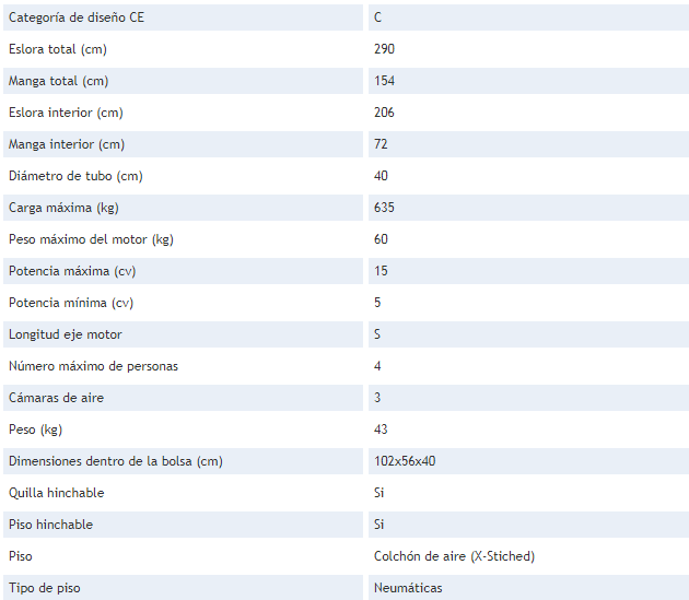 O elegante barco inflável Mercury Air Deck Deluxe 290 pode instalar um motor de popa de até 15 HP. Com um peso de 43 Kg. É fácil de manusear, o que facilita um transporte rápido e a possibilidade de viajar com ele em qualquer lugar. Como o resto dos barcos infláveis Mercury Air Deck Deluxe, o 290 tem o piso inflável com costura X, remendos antiderrapantes, assento de poliéster e travessão protegido. É uma pneumática muito completa, com uma construção e design da melhor qualidade.