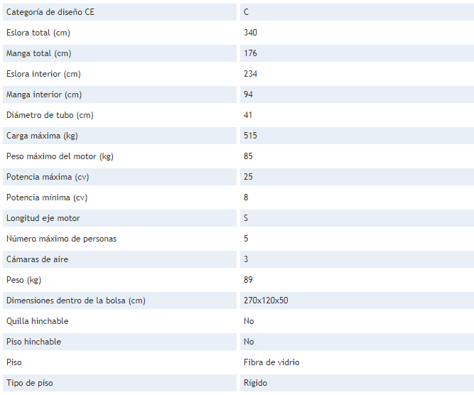 Como no resto dos barcos Ocean Runner, este semi-rígido possui uma série de 4 pontos de elevação. O barco inflável Mercury 340 Ocean Runner é oferecido com uma caixa de proa para manter seus pertences secos e protegidos de outros elementos. Equipado com o console opcional Jockey Junior e com um motor de popa de até 25 HP, o Ocean Runner 340 é transformado em um barco de aparência esportiva. Além disso, para maior conforto e segurança, os carros alegóricos têm cordas como alças.
